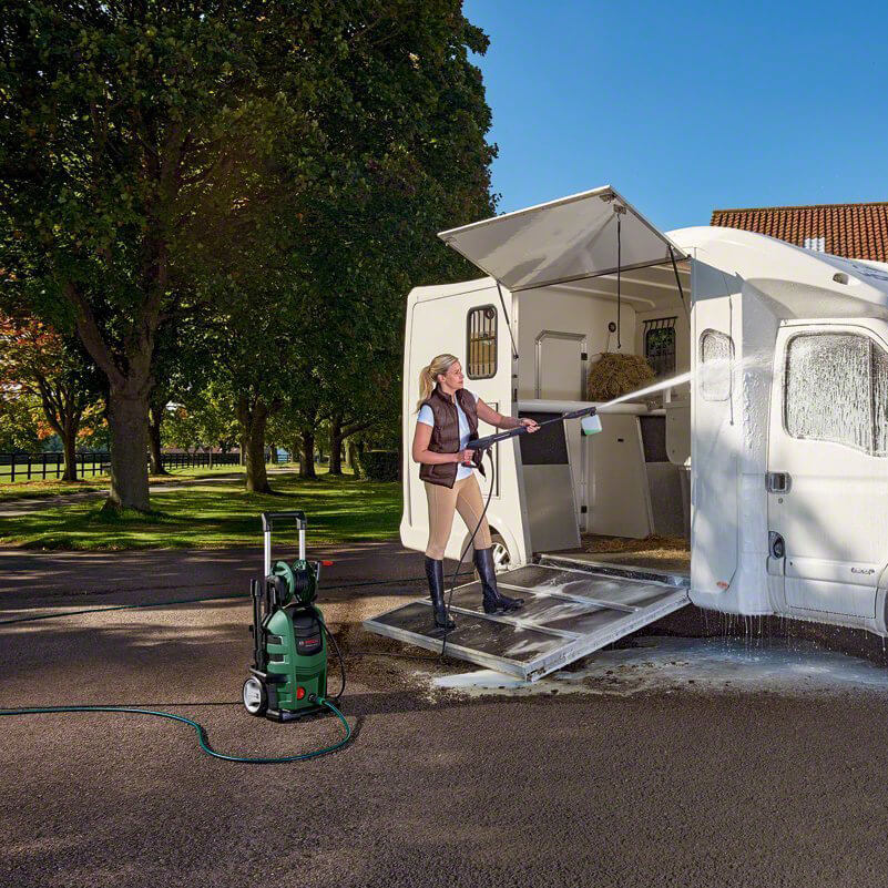 Kinh nghiệm mua máy rửa xe gia đình bạn nên chọn sản phẩm có tính năng hút nước tự động lấy nước từ xô chậu không lo tụt áp khi làm vệ sinh. Dây phun dài kết hợp với đầu phun xoay, phun tia và phun xà phòng linh hoạt, đánh bay mọi bám bẩn. Ví dụ như máy xịt rửa cao áp Bosch AQT 110 mô tơ chổi than công suất 1300W, áp lực 110 bar là gợi ý sáng giá.