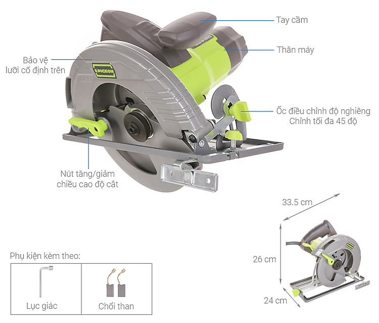 Chiếc máy cắt Pigeon đạt công suất 1500W cùng với tốc độ không tải tối đa đến 5500 vòng/phút, mang lại hiệu quả cắt nhanh chóng. Đồng thời, máy cắt gỗ này sử dụng lưỡi cưa có đường kính 18.5cm làm cho việc cắt vật liệu trở nên dễ dàng hơn.