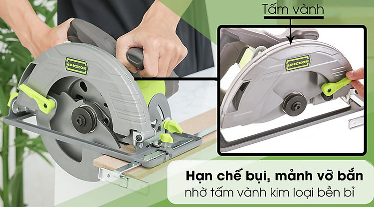 Chiếc máy cắt gỗ Pigeon này còn được trang bị tấm vành kim loại phía trên vật liệu cắt, giúp người dùng tránh được bụi gỗ cũng như các mảnh vỡ bắn ra từ quá trình cắt vật liệu.