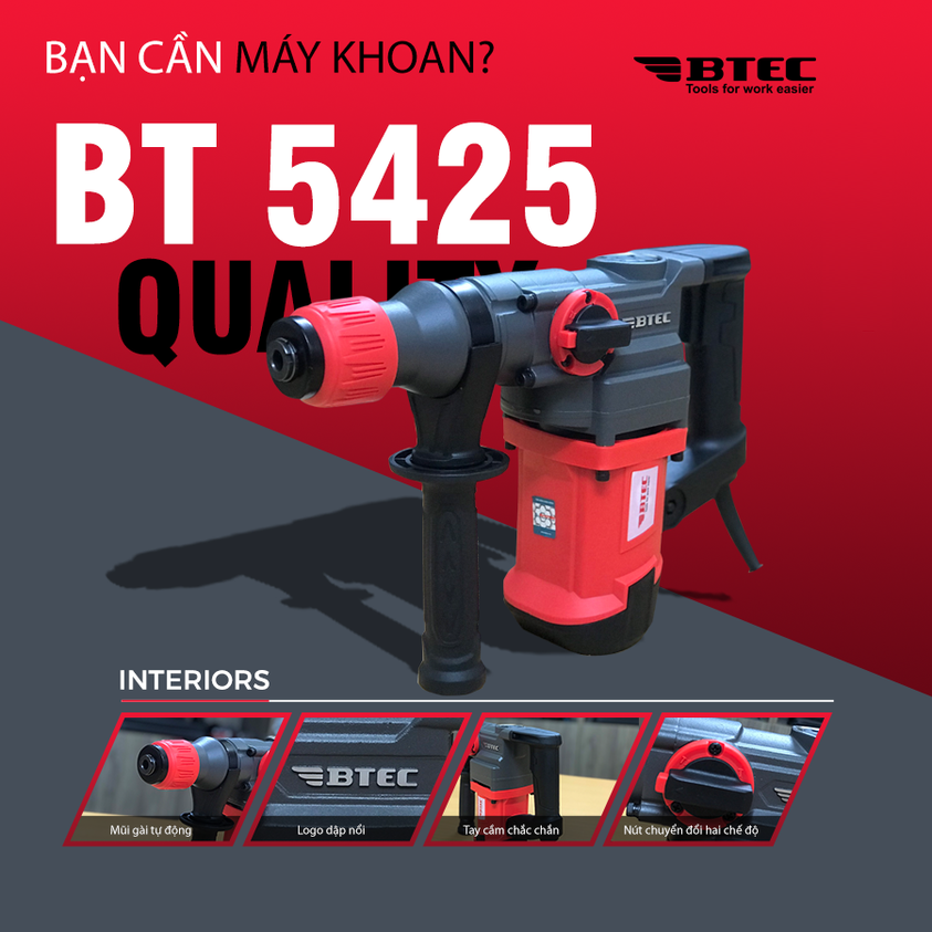 BTEC BT5425 sử dụng chất liệu cứng cáp, tay cầm chính chắc chắn, cùng tay cầm phụ chống trơn trượt hiệu quả. Máy khoan bê tông BT5425 thiết kế núm vặn thay đổi chức năng ngay trên thân máy giúp người thợ điều chỉnh chế độ khoan hoặc đục theo đúng nhu cầu.