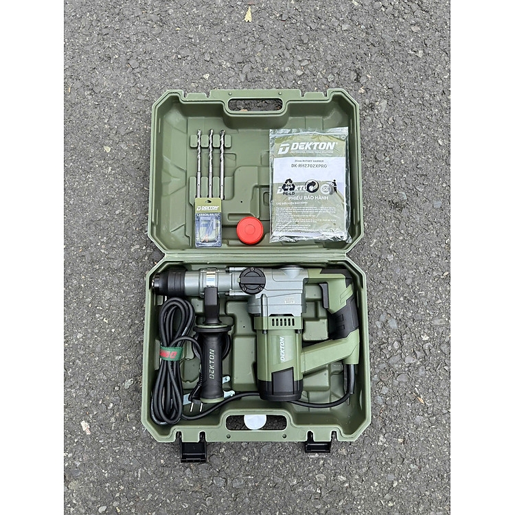 Máy khoan đục bê tông DK-RH2702XPRO là giải pháp chuyên dụng cho các tác vụ phá dỡ và khoan cấy thép nhờ lực đập cực mạnh lên đến 4.5J. Thuộc dòng XPRO cao cấp, máy được tối ưu hóa với 2 chức năng chính giúp tập trung tối đa công suất vào cơ chế búa, đảm bảo khả năng đục phá bê tông mạnh mẽ và nhanh chóng. Máy sử dụng đầu gài SDS Plus tiêu chuẩn, giúp cố định mũi khoan/đục chắc chắn và chịu tải cao. Sản phẩm đi kèm trọn bộ phụ kiện gồm 3 mũi khoan và 2 mũi đục chất lượng, tất cả được bảo quản trong hộp nhựa BMC dày dặn, bền bỉ. Với màu xanh Olive chuyên nghiệp và thiết kế giảm chấn tối ưu, DK-RH2702XPRO là người bạn đồng hành tin cậy cho các anh em thợ công trình hạng nặng.