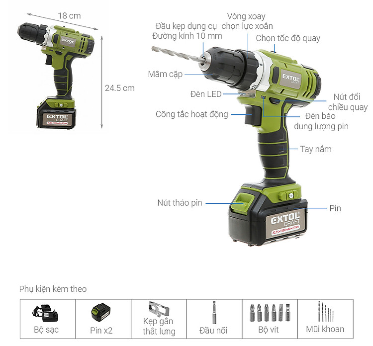 Máy khoan pin Extol 402440 sở hữu kiểu thiết kế nhỏ gọn với chiều dài 24.5 cm, ngang 18 cm, dày 8.4 cm và khối lượng chỉ hơn 1kg, giúp bạn dễ thao tác trong không gian nhỏ hẹp và tiện lợi cho việc cất giữ.