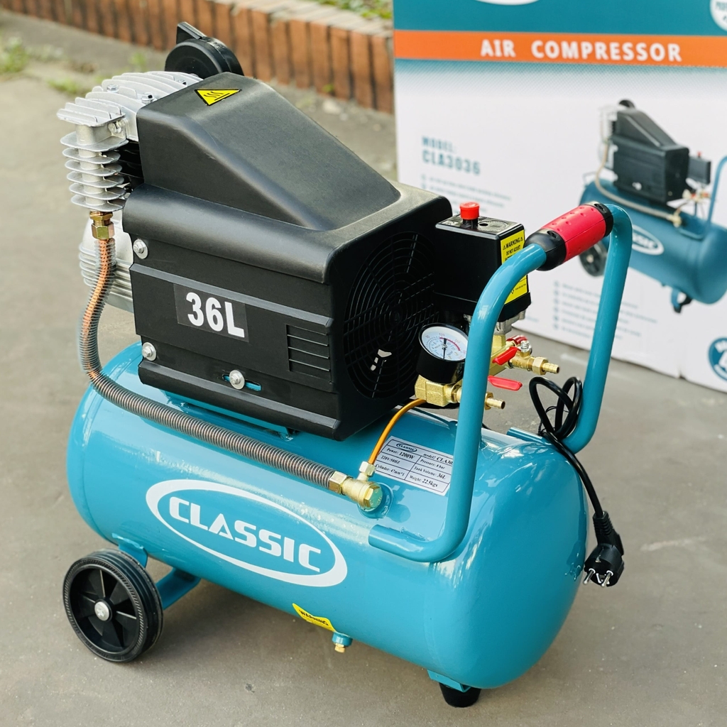 Máy nén khí có dầu Classic CLA3036 (36L, 3HP) là dòng máy nén khí công suất trung bình, dung tích vừa phải 36L, sử dụng dầu bôi trơn, công suất động cơ 3HP mạnh mẽ, phù hợp cho tiệm sửa xe, công việc thủ công, phun sơn, bắn đinh, đáp ứng nhu cầu khí nén liên tục với thời gian nạp khí nhanh (khoảng 75s), thiết kế hiện đại, linh hoạt trong vận hành và dễ di chuyển.
