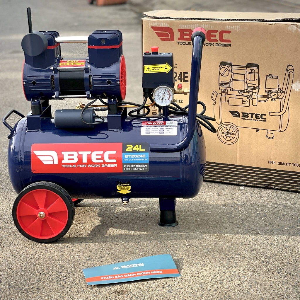 Máy nén khí không dầu BTEC BT-2024E (24 lít) là dòng máy nhỏ gọn, êm ái, sử dụng động cơ đồng, không cần nhớt, phù hợp các công việc đòi hỏi khí sạch và tiếng ồn thấp (phòng khám, tiệm sửa xe), với dung tích bình 24L, công suất 600W, áp suất 8 Bar, cho lưu lượng 102L/phút, có chân đế cao su giảm rung, hoạt động điện 1 pha 220V, thích hợp dùng trong gia đình hoặc các tiệm nhỏ.