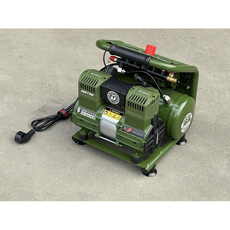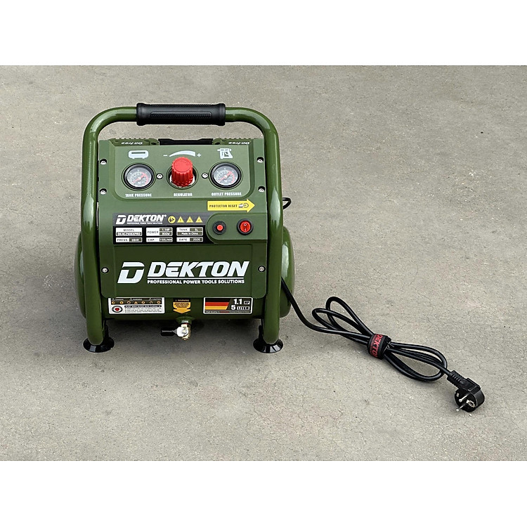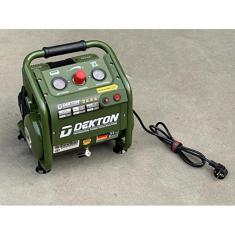 Máy nén khí không dầu thế hệ mới mang thương hiệu Dekton sở hữu thiết kế đột phá với màu xanh Oliu mạnh mẽ và khung bảo vệ kim loại chắc chắn.