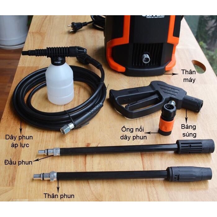 Máy rửa xe Btec BT70PA bao gồm 1 thân máy, 1 báng súng, 1 thân súng, 1 đầu súng điều chỉnh tia, cút nước đầu vào, và bình xịt xà phòng.