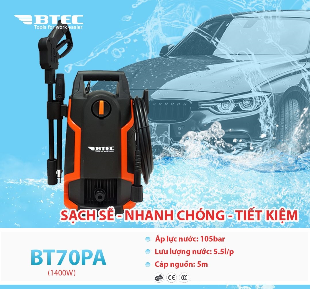 Máy rửa xe Btec BT70PA đến từ thương hiệu cao cấp của Nhật Bản, với công suất 1400W, trang bị motor chổi than mạnh mẽ cho áp lực phun tối đa 105 bar.