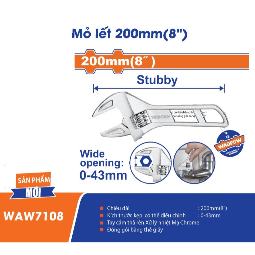 Mã WAW7108 mỏ lết của thương hiệu Wadfow. Đây là dụng cụ cầm tay phổ biến được sử dụng trong sửa chữa và lắp đặt cơ khí.