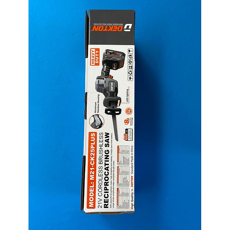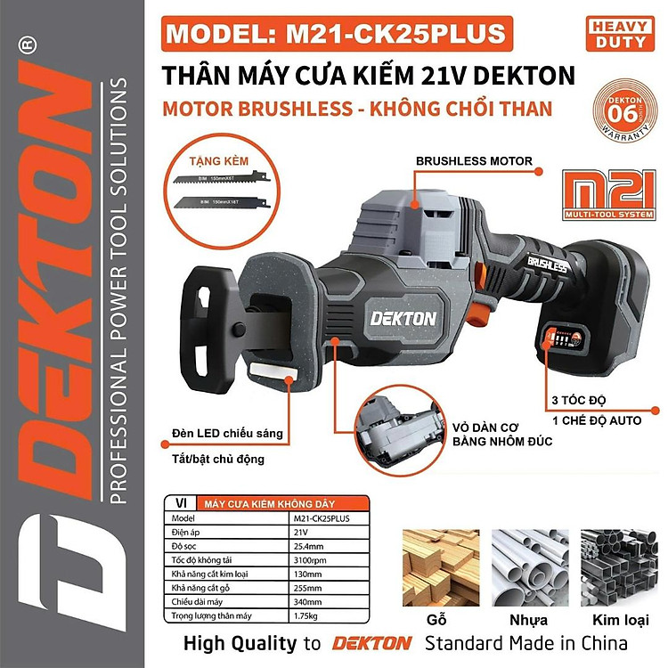 Máy cưa kiếm pin Dekton M21-CK25PLUS là dòng máy cưa chuyên nghiệp thuộc phân khúc Plus cao cấp, được thiết kế để chinh phục những công việc cắt gọt nặng nề nhất. Máy sở hữu động cơ không chổi than (Brushless) hiệu suất cao, mang lại sức mạnh vượt trội, vận hành êm ái và tiết kiệm pin tối ưu. Với độ sọc lên đến 25.4mm, máy cho phép thực hiện những nhát cắt dứt khoát và nhanh chóng trên nhiều bề mặt vật liệu khác nhau.