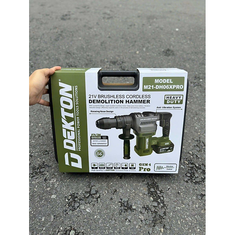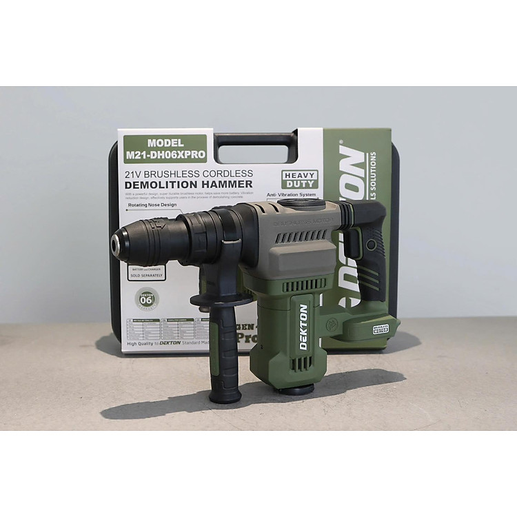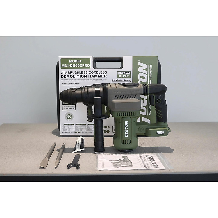 Thân máy đục bê tông pin Dekton M21-DH06XPRO là phiên bản màu Olive mạnh mẽ, chuyên dụng cho các công việc đục phá bê tông cường độ cao. Với lực đập lên đến 6J và động cơ không chổi than (Brushless) hiện đại, máy cung cấp sức mạnh phá dỡ tương đương các dòng máy dùng điện nhưng vẫn đảm bảo tính linh hoạt tối đa của thiết bị dùng pin. Nhịp búa đạt 3400BPM giúp việc đục tỉa, phá dỡ các bề mặt bê tông cứng và tường gạch trở nên nhanh chóng và hiệu quả hơn.