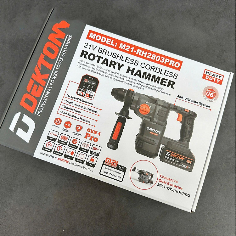 Thân máy khoan đục bê tông pin Dekton M21-RH2803PRO là dòng máy khoan động lực phân khúc chuyên nghiệp với khả năng kết nối đồng bộ với máy hút bụi, giúp môi trường làm việc luôn sạch sẽ và bảo vệ sức khỏe người thợ. Máy trang bị động cơ không chổi than (Brushless) mạnh mẽ, cung cấp lực đập lên đến 3.2J và hệ thống điều chỉnh 6 cấp tốc độ linh hoạt cho từng loại vật liệu. Sản phẩm sở hữu đầy đủ các công nghệ hiện đại nhất: hệ thống giảm rung (AVT), tính năng an toàn Anti-Kickback chống bẻ cổ tay, chế độ tạo xung hỗ trợ khoan vật liệu cứng và tính năng ghi nhớ độ sâu khoan thông minh. Thiết kế thân máy chắc chắn với màu Olive đặc trưng, phù hợp cho các tác vụ khoan, khoan đục và đục bê tông cường độ cao tại công trường.