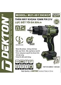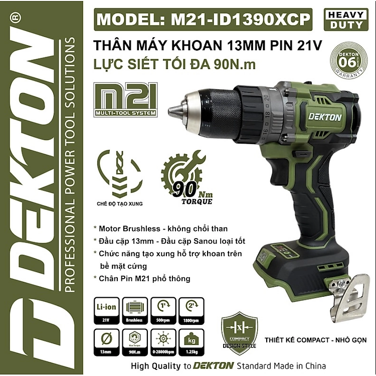 Thân máy khoan pin Dekton M21-ID1390XCP sở hữu sức mạnh vượt trội với lực siết 90N.m và tính năng tạo xung hiện đại giúp khoan gạch men hoặc các vật liệu cứng chính xác hơn. Máy tích hợp 3 chức năng linh hoạt bao gồm khoan gỗ sắt gạch men, bắt vít có cấp trượt bảo vệ bề mặt và chế độ khoan tường búa mạnh mẽ. Thiết kế đầu kẹp kim loại 13mm đảm bảo độ bền cao và khả năng giữ mũi khoan chắc chắn trong quá trình làm việc nặng. Sản phẩm có màu Oliu bền bỉ và thuộc hệ sinh thái pin M21 phổ thông.